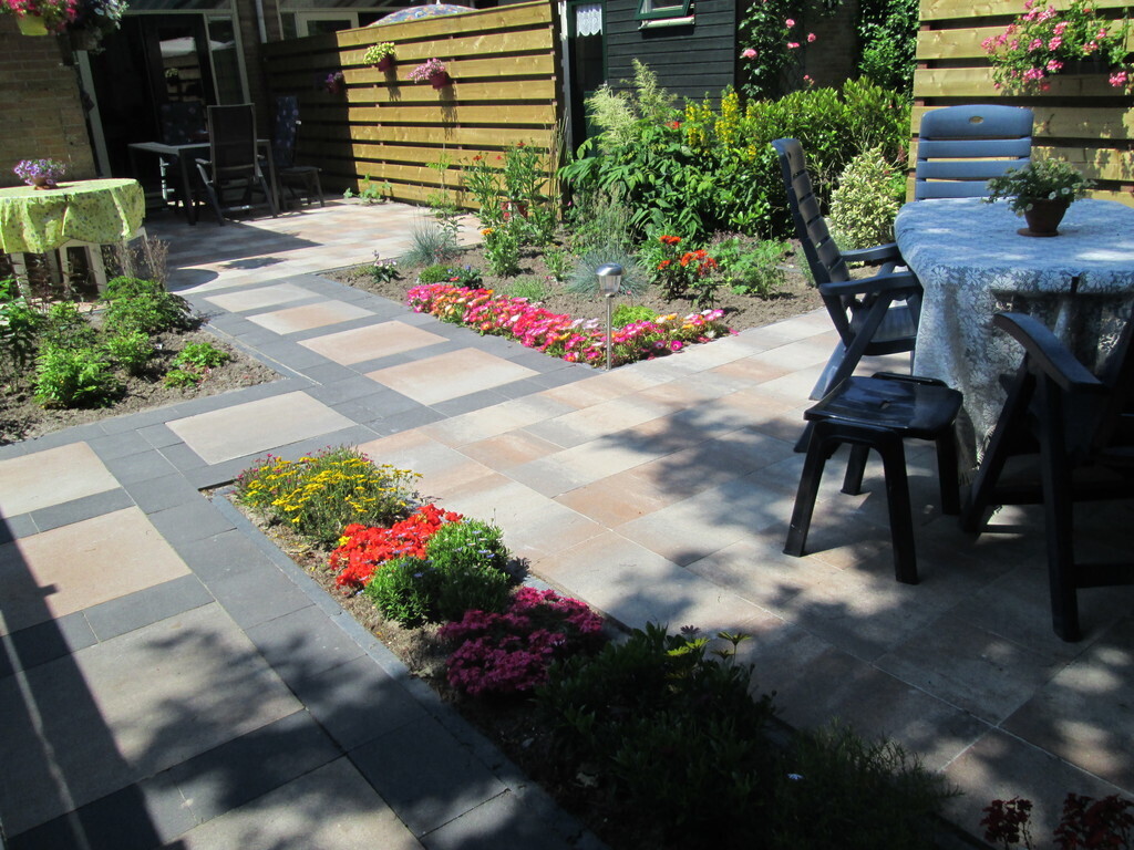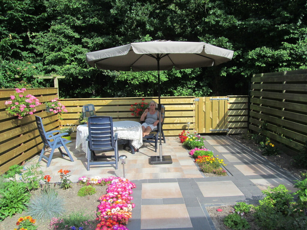 The garden is sunny and there is a double set of garden furniture and a big garden umbrella for some shade.