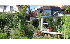 Our house was built in 1935 and still has some authentic details, such as the colourful 'jugendstil' glass sliding doors. Downstairs we have a living room and adjacent conservatory, kitchen and library and a lavatory, upstairs one bedroom with double bed (1.40 m. x 2.00 m.), one with a single bed, a study and a bathroom. We usually keep the study for storing our own personal belongings, to leave more room for you. The rooms are small, but cosy and comfortable.