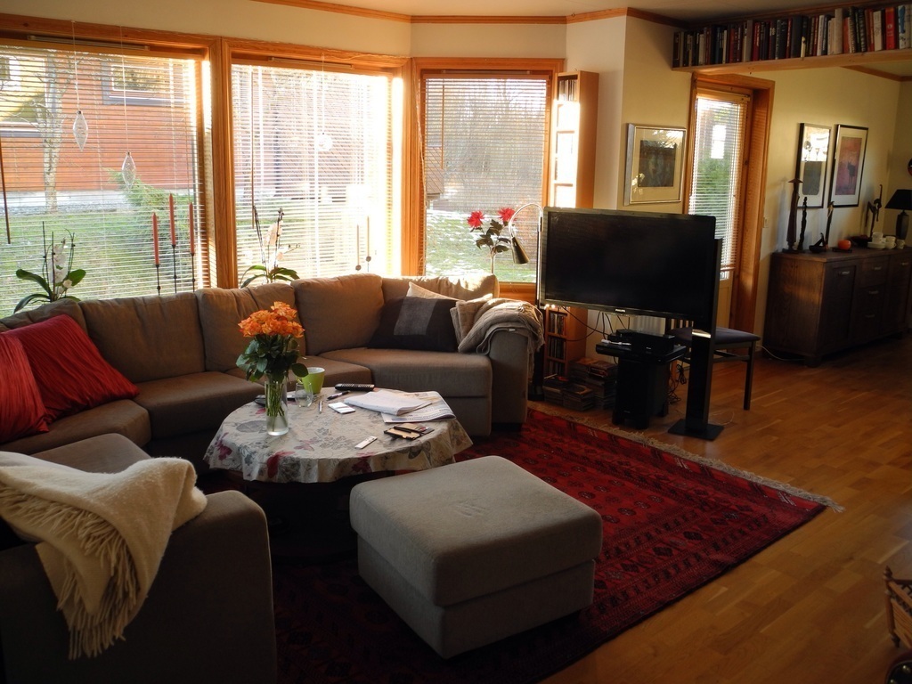 Our house has two bathrooms with shower and a bath tube, a laundry room with a washing machine, three bedrooms, a room for books and a piano, kitchen and a living room with tv and hifi.