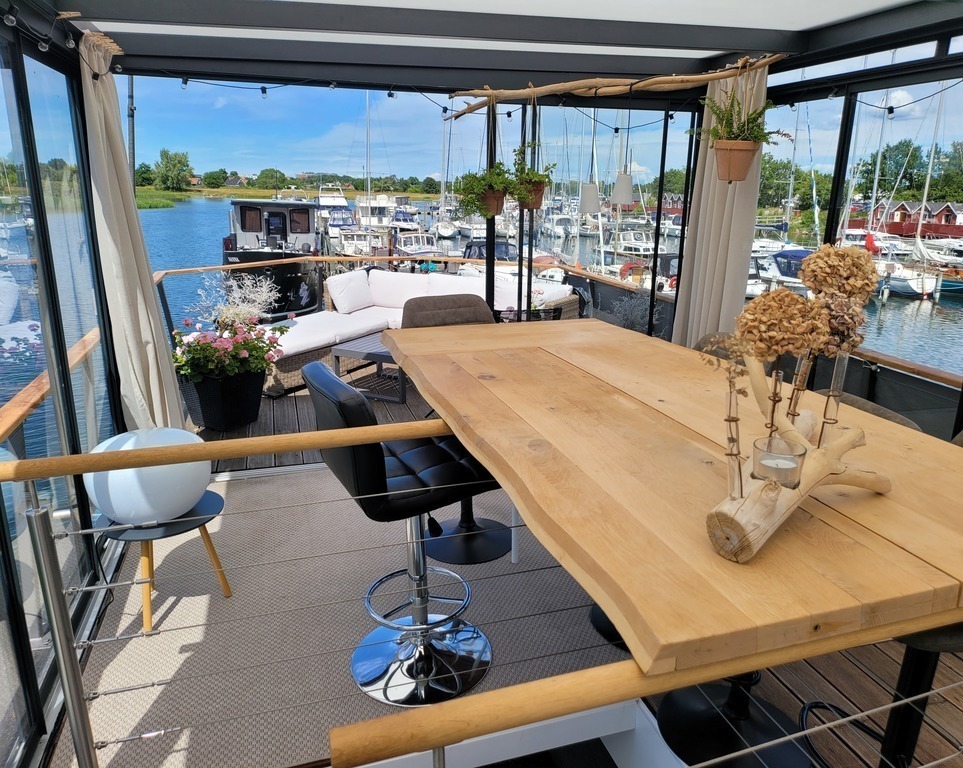 On the top floor you will find our fantastic conservatory, which serves as both a dining area and TV room, in front of the boat you will find a lovely sun terrace.