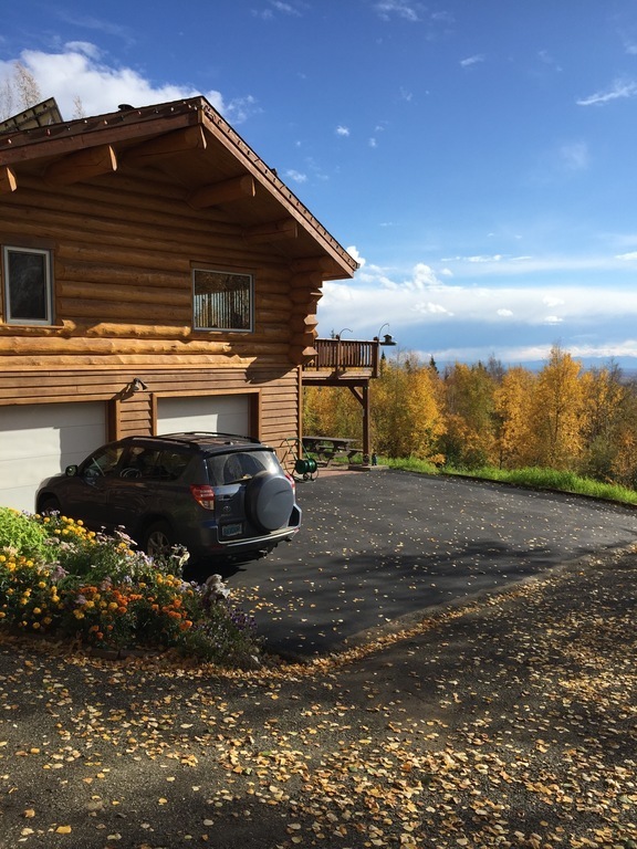 We have a two bedroom, natural scribe-fit log home (built in 1988 and having all the modern amenities) in the hills overlooking Fairbanks, Alaska. Our home sits on a fairly secluded two acres, surrounded by birch and aspen trees in a quiet neighborhood - the neighbors are mostly hidden by the surrounding forest. The deck on the south side of our home has no neighbors visible in the summer, but does have a view of the historic small city of Fairbanks below. Fairbanks, with its international airport, is in the center of Alaska and is just a quick seven mile drive away. You will have use of our 2011 RAV4 Toyota for transportation whether for a three hour drive to Denali Park or a day's drive to Anchorage. Also available are two new, comfortable bikes for your use exploring Fairbanks trails or on your trips out of town, as well as two kid bikes.