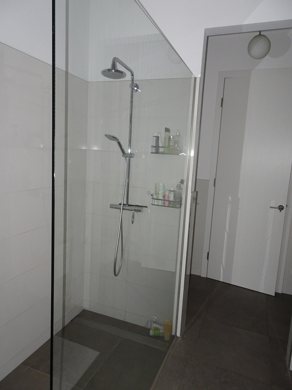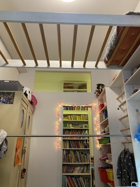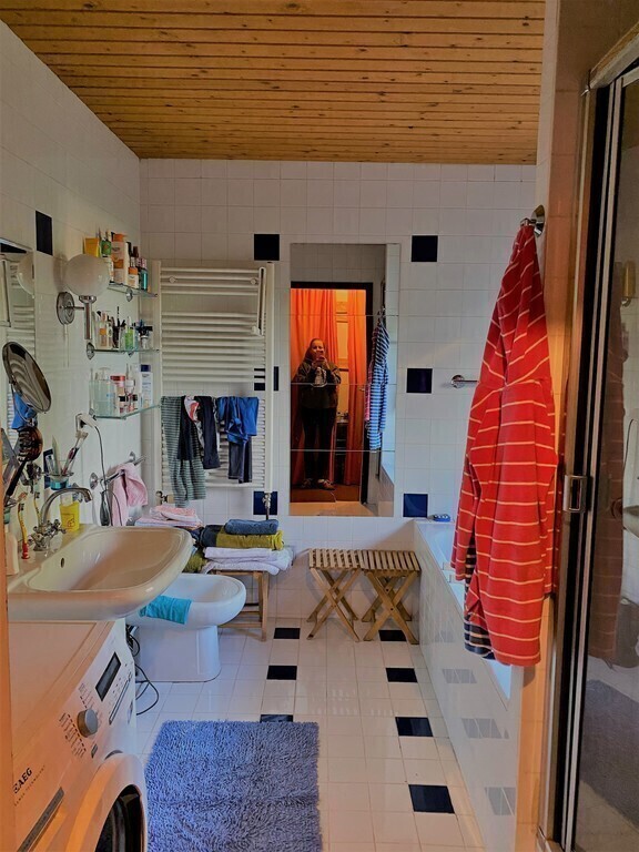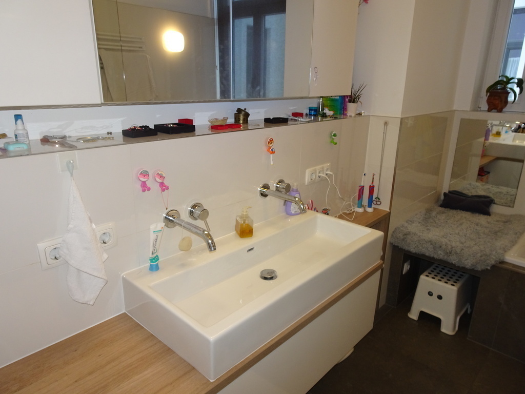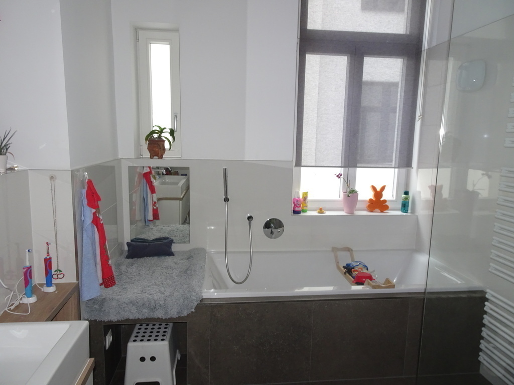 From the entry room you can go to the toilette, the living room and the kitchen. A corridor leads to the second toilette (including washing machine and dryer), the bathroom, the childrensroom and the bedroom.