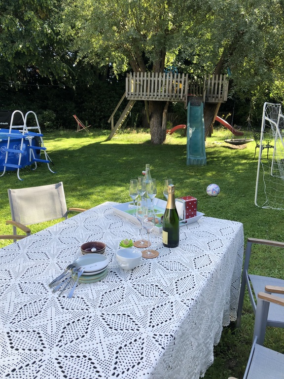 Spacious villa with nice garden with tree house, sandpit and fire pit. Lots of shady spots and space to build camps in the forest. Several bicycles available.