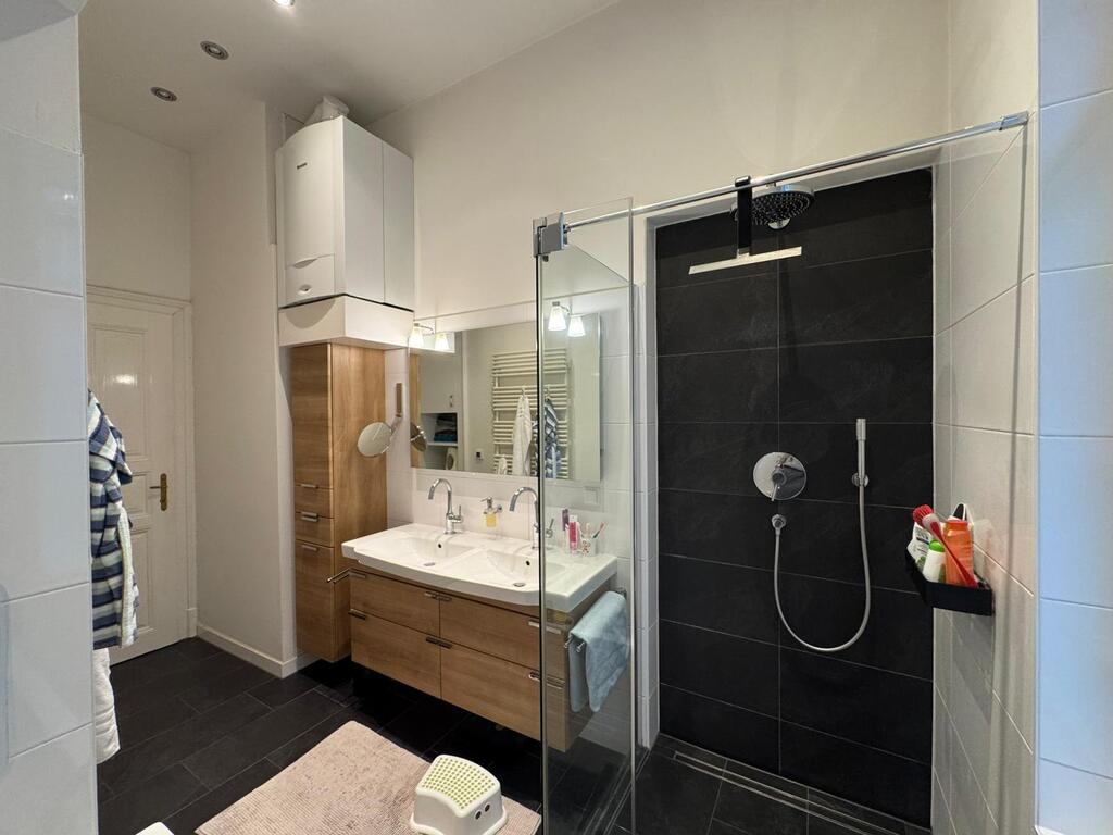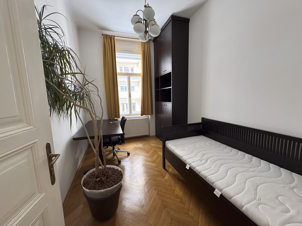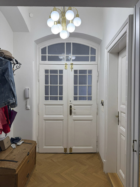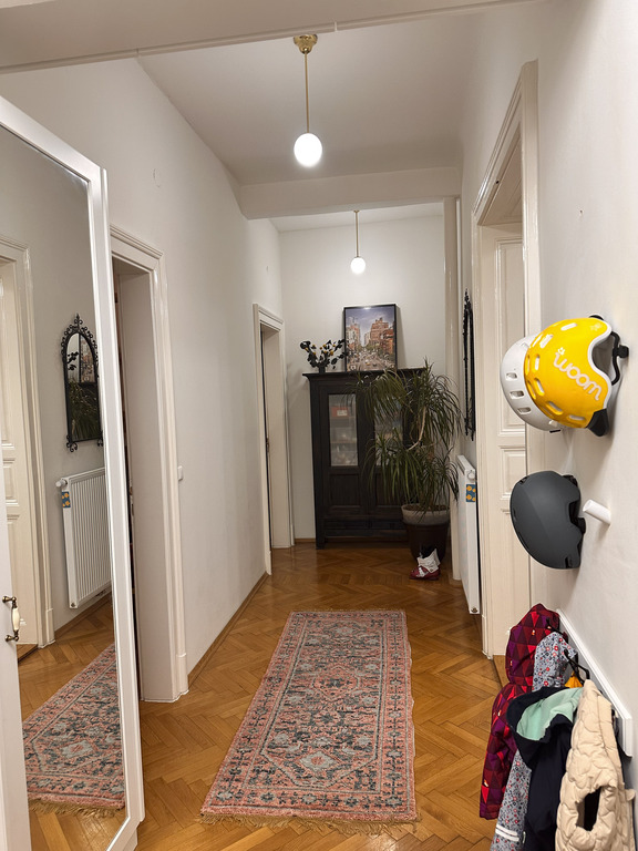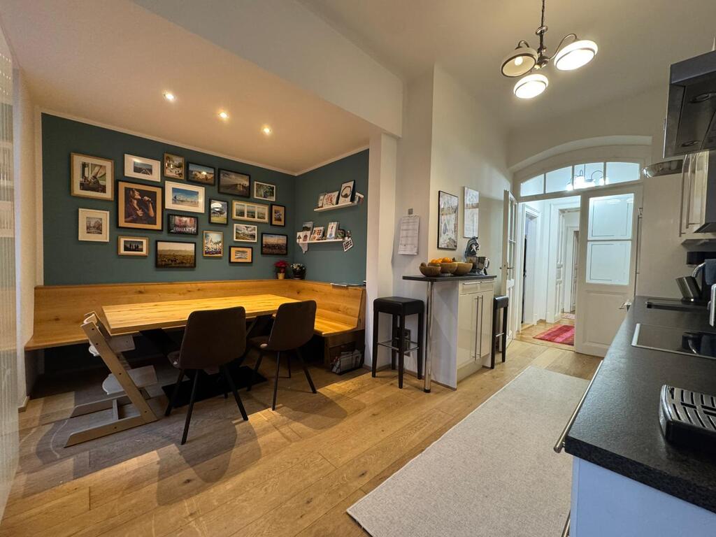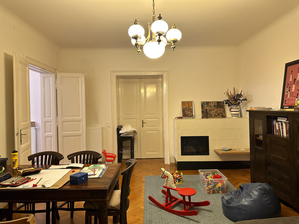 Unsere geräumige Altbauwohnung hat 130 m² und befindet sich im 1. Stock (ohne Lift) und bietet 3 Schlafzimmer mit 4 fixen Betten und einigen optionalen Schlafmöglichkeiten (Schlafsofa und Matratzen), ein Bad mit Dusche und Badewanne, das große Wohnzimmer mit Esstisch, Kamin und viel Platz zum Entspannend, die Wohnküche mit Esstisch Zugang zum Balkon ins Grüne.