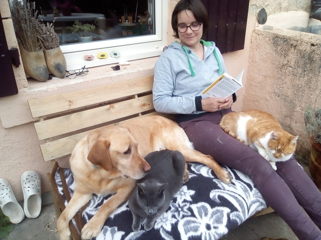 We have got 2 cats ( Titus and Patate) and 1 service dog of Labrador breed (Manzana) .