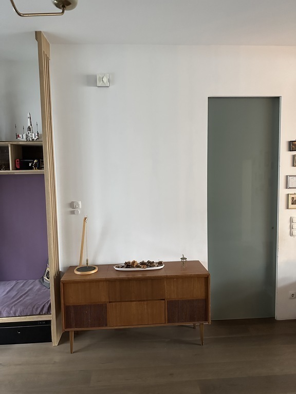 From the entry room you can go to the toilette, the living room and the kitchen. A corridor leads to the second toilette (including washing machine and dryer), the bathroom, the childrensroom and the bedroom.