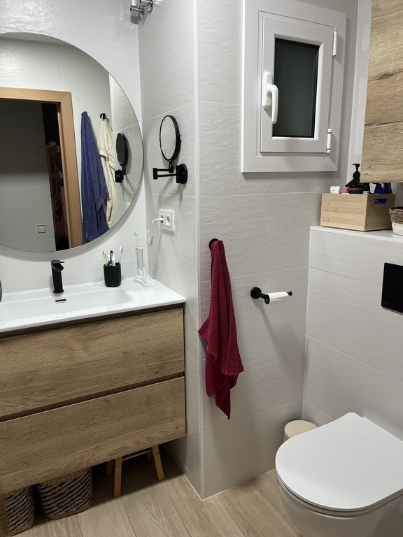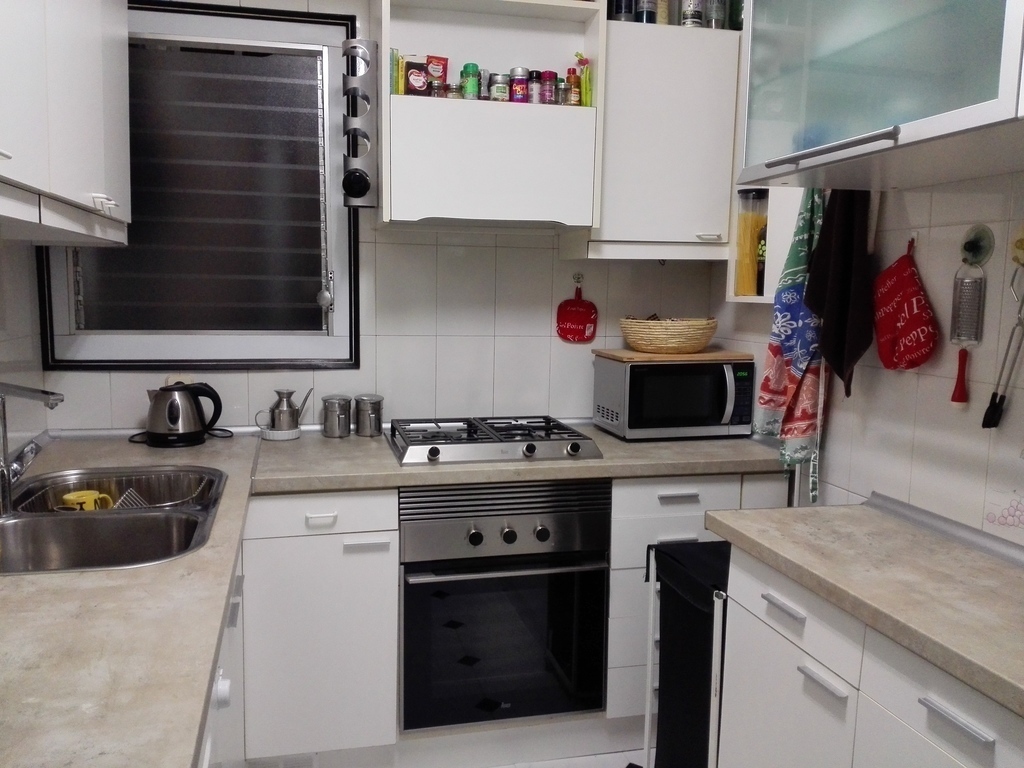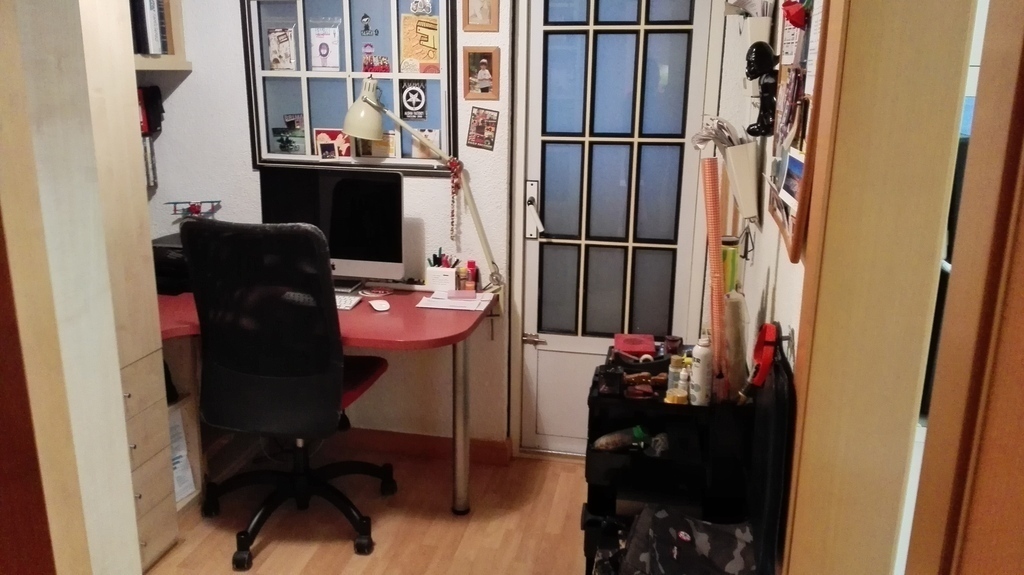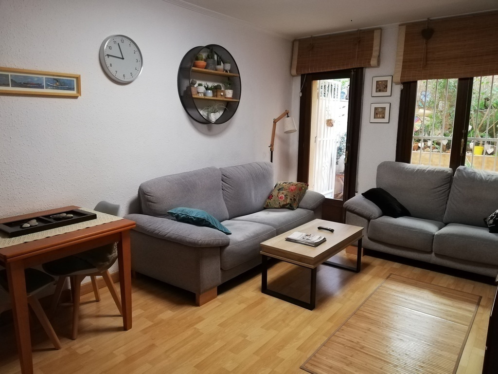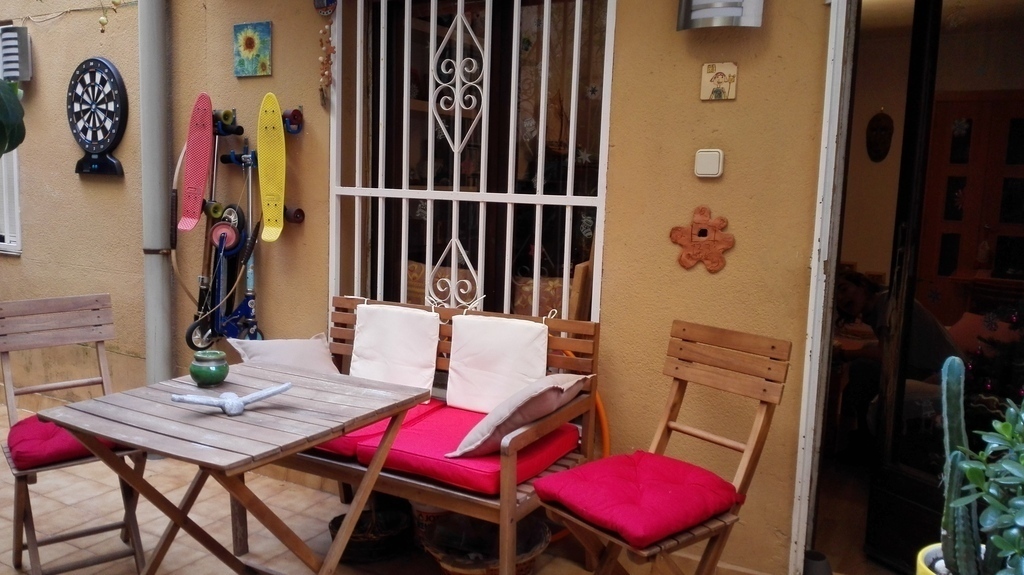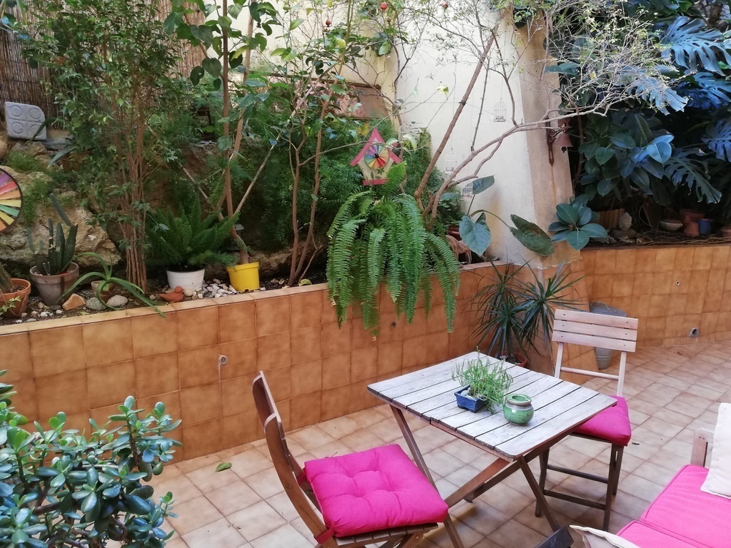 The flat has a small yard with a lot of plants, 2 bedrooms (one with bunk beds and another with a double bed), a small office, one bathroom and a well equipped kitchen.