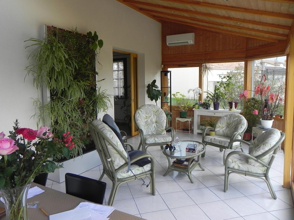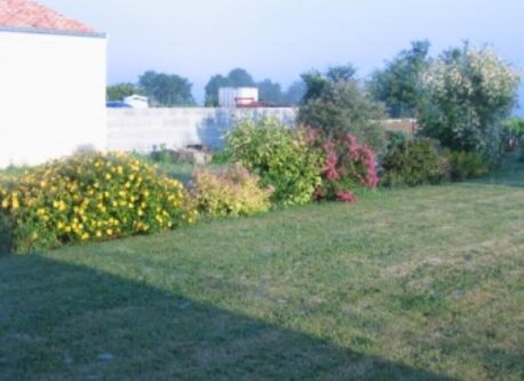 The veranda is open on a lawn and an open landscape. Outside a large lawn and a small vegetable garden.