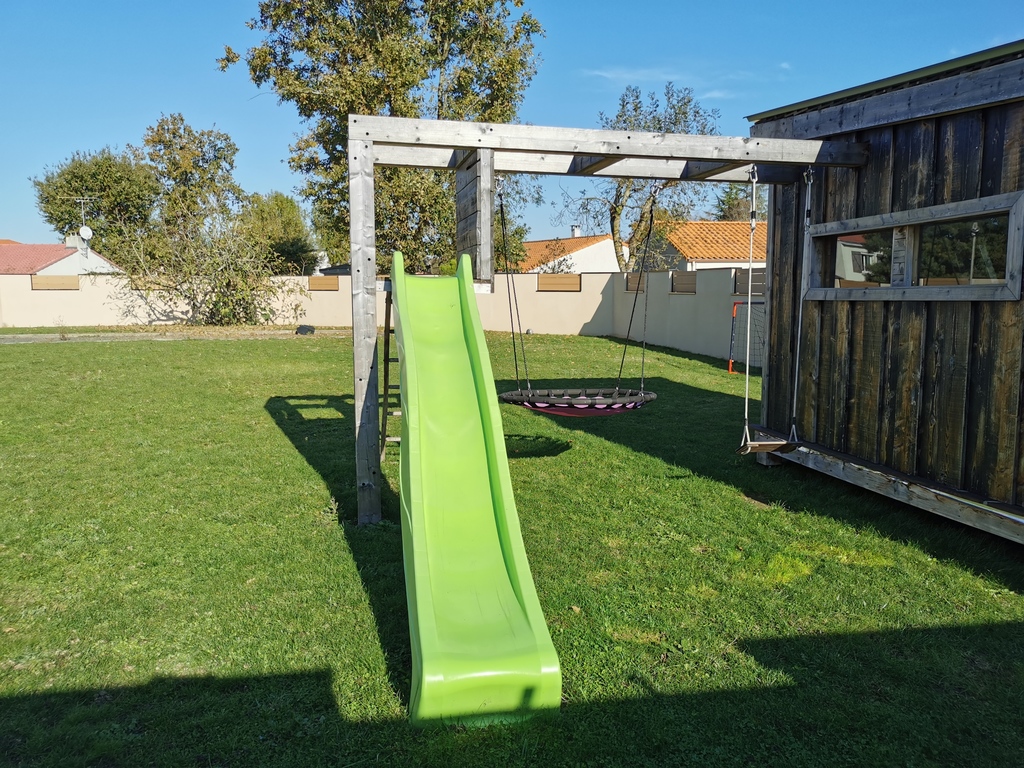 We are a family of 4 people and we live in a 160 m² house with a 700 m² garden including a swing, a slide and a bowling green.