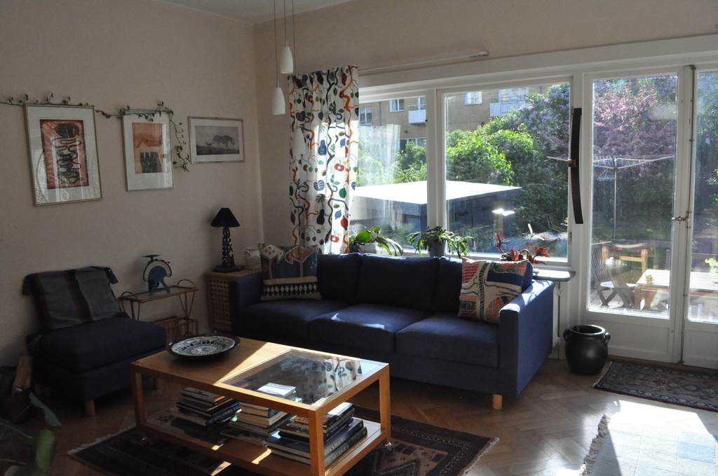 Our home is situated 7 km from the City of Stockholm, but the surroundings are very much like in the country side. on the ground floor there is a kitchen and a living room, and also an entrance to the garden. on the upper floor there are two bed-rooms, one with a double bed and one with a bunk bed, and in the basement a TV-room. The garden is sunnny and a place for flowers and bird visitors. You have an easy access to Stockhom by the unbderground, only 10 minutes ride.